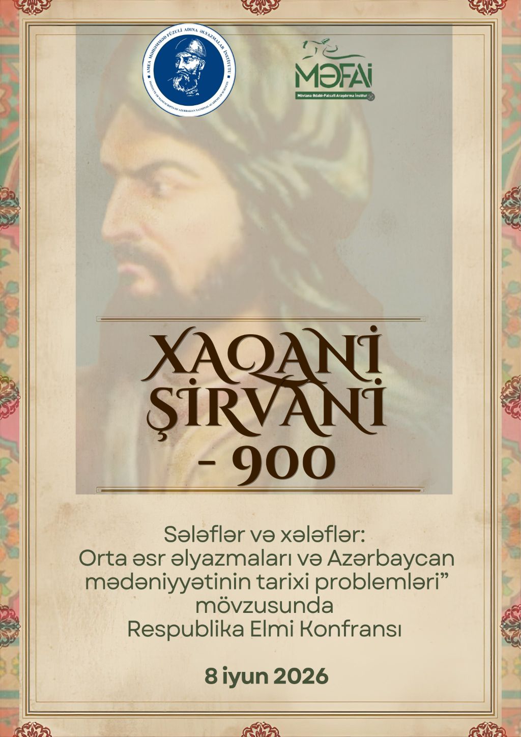 AMEA Məhəmməd Füzuli adına Əlyazmalar İnstitutu və Xəzər Universitetinin Mövlana Ədəbi-Fəlsəfi Araşdırmalar İnstitutunun birgə təşkilatçılığı ilə dahi Azərbaycan şairi Xaqani Şirvaninin anadan olmasının 900 illiyinə həsr olunmuş “Xaqani Şirvani 900 – Sələflər və xələflər: Orta əsr əlyazmaları və Azərbaycan mədəniyyətinin tarixi problemləri” mövzusunda Respublika Elmi Konfransı keçiriləcəkdir.
