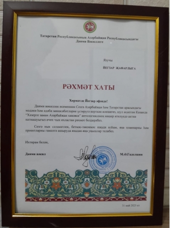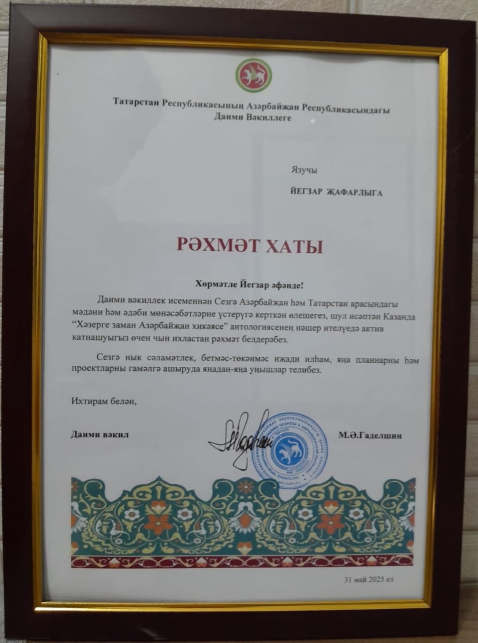 2025-ci il mayın 31-də Rusiya Federasiyası Tatarıstan Respublikasının Azərbaycandakı daimi nümayəndəliyində Kazandakı “Yazıçı” nəşriyyatında nəfis şəkildə işıq üzü görmüş “Хəзерге заман Aзəрбайжан хикəясе” (“Çağdaş Azərbaycan hekayəsi”) antologiyasının təqdimatı keçirilib.
