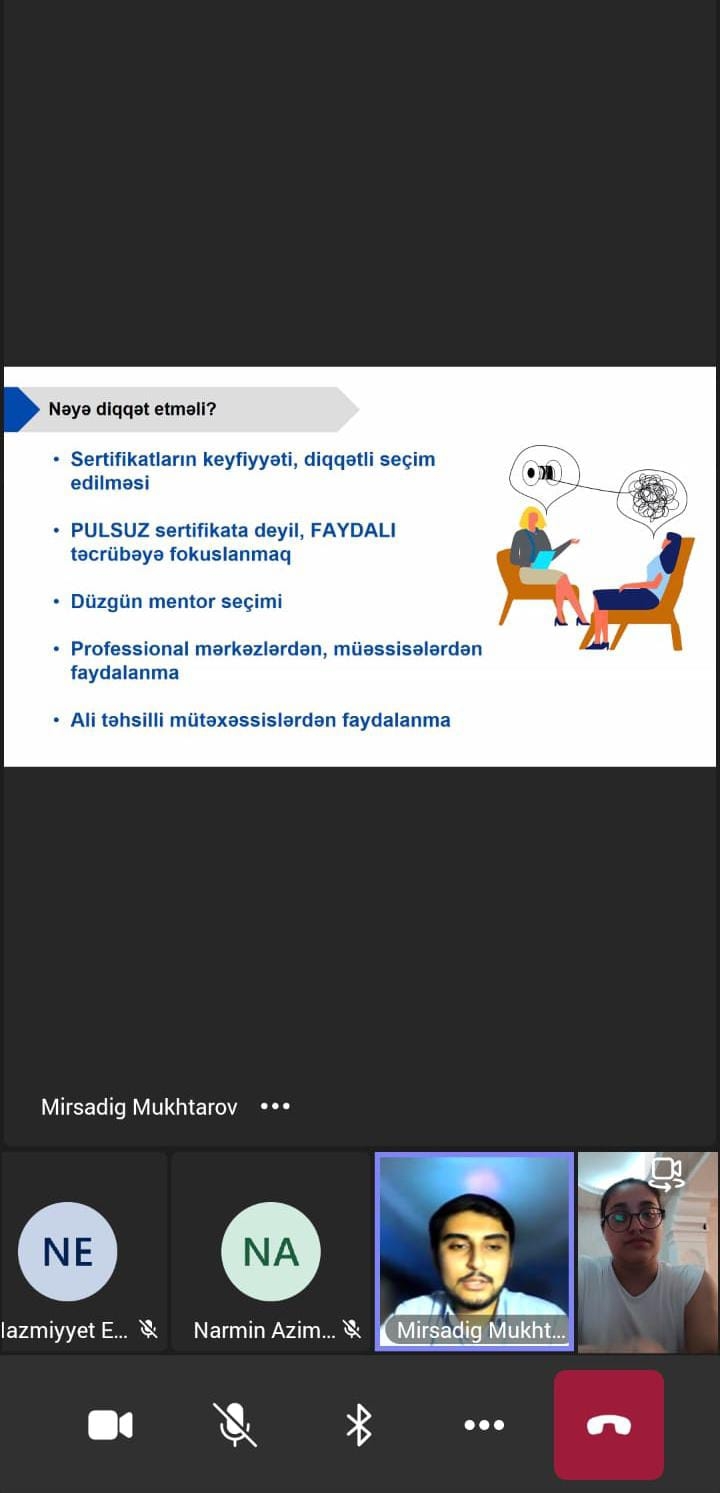 Seminarda Mirsadiq Muxtarov karyera yolunda praktik bacarıqların əldə edilməsinin faydalarını vurğulamışdır. Xüsusilə tələbələrin karyera yolunda düzgün və faydalı təcrübələrin nə dərəcədə önəmli olduğu, həmçinin professional mentor dəstəyinin vacibliyi qeyd edilmişdir. Bununla yanaşı, o, psixologiya sahəsində gələcəkdə nəzərdə tutulan inkişaf imkanlarına qiddət çəkərək, tələbələr və gənc mütəxəssislər üçün açıq olan yeni istiqamətlər barədə ətraflı məlumat vermişdir.