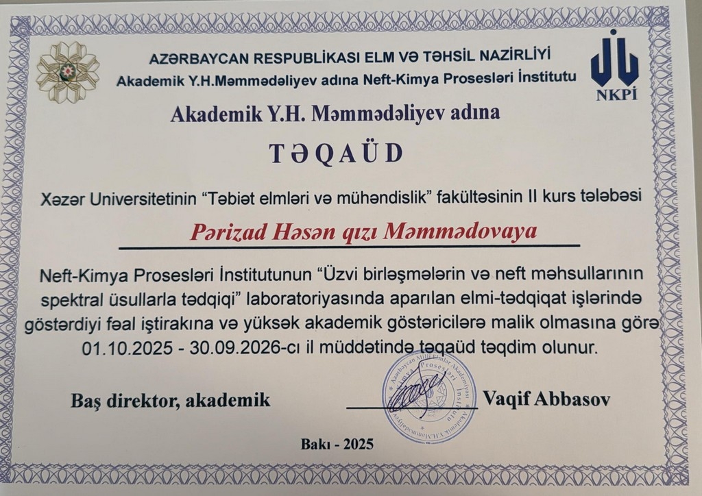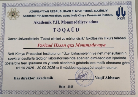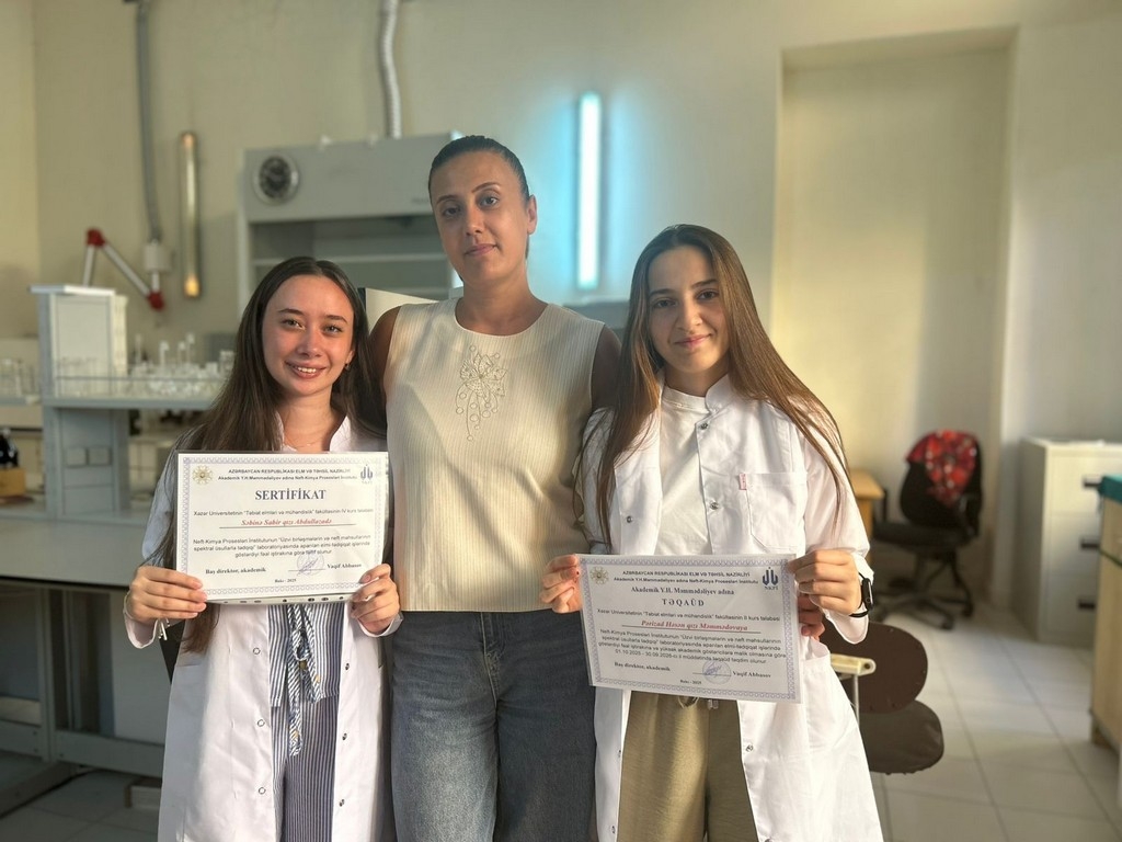 Təbiət elmləri və mühəndislik fakultəsinin Kimya müəllimliyi ixtisasında təhsil alan tələbələrindən Pərizad Məmmədova və Səbinə Abdullazadə avqust ayının birindən etibarən Elm və Təhsil Nazirliyinin akademik Y.H. Məmmədəliyev adına Neft-Kimya Proseslərİ İnstitutunda təcrübə keçmişlər. Bu müddətdə tələbələr bir sıra analiz metodları və üzvi birləşmələrin sintezi metodikası ilə həm əyani tanış olmuş, həm də təcrübələrdə fəal iştirak etmişlər. Təcrübə müddətində yüksək aktivlik göstərmiş Pərizad Məmmədova Neft-Kimya Proseslərİ İnstitutunun baş direktoru Akademik Vaqif Abbasov tərəfindən Y. Məmmədləliyev adına təqaüdlə təltif olunmuş, Səbinə Abdullazadəyə isə sertifikat verilmişdir.