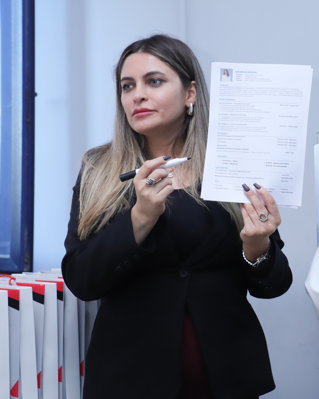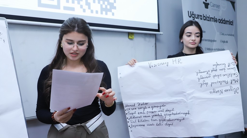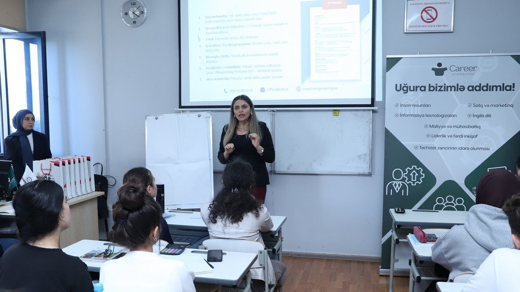 Tədbir zamanı HRENGİNEERİNG MMC-nın təsisçisi və icraçı direktoru, İnsan resurslarının idarə edilməsi üzrə ekspert Aynur Mirzəzadə karyera planlamasına giriş və SWOT analizi, peşəkar CV və motivasiya məktubunun hazırlanması, müsahibə mərhələlərinə hazırlıq və strategiyalar və digər mövzularda çıxış edib.