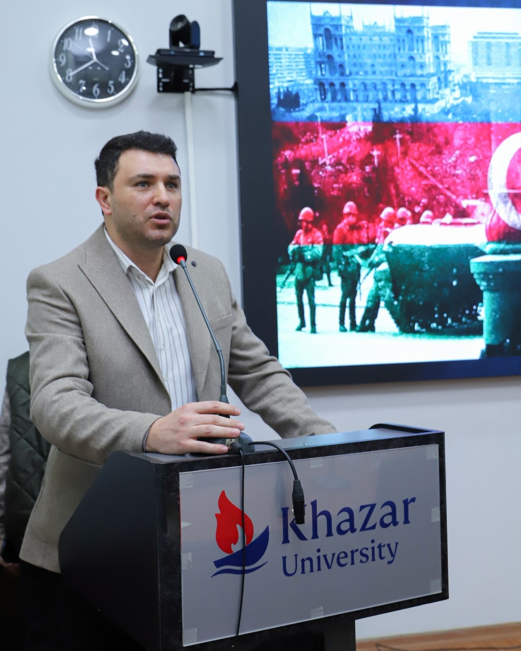 Tarix və Arxeologiya departamentinin müəllimləri Dr. Söhrab Mustafayev, Dr. Odər Əlizadə, Dr. Ülviyyə İbrahimova və Xəzər Universitetinin İctimai Əlaqələr və Media üzrə direktoru Əlövsət Əmirbəyli çıxış etdilər. Çıxışlarda Sovet imperiyasının Azərbaycan xalqına qarşı həyata keçirdiyi misli görünməyən vəhşilik, 20 yanvar hadisələrinin mahiyyəti, xalqımızın milli müstəqillik və ərazi bütövlüyümüz uğrunda göstərdiyi mübarizə ruhu, Moskvanın bütün təzyiqlərinin, qorxu yaratmaq cəhdlərinin milli birlik və həmrəyliklə dəf edildiyi qeyd olundu.