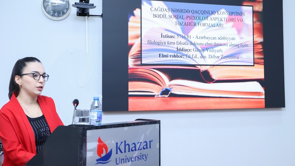 2025-ci il fevralın 6-da Xəzər Universitetinin Dillər və ədəbiyyatlar departamentinin doktorantı Günay Yaşar qızı Yediyarlının filologiya üzrə fəlsəfə doktoru elmi dərəcəsi almaq üçün yerinə yetirdiyi “Çağdaş nəsrdə qaçqınlıq konseptinin bədii, sosial-psixoloji aspektləri və təzahür formaları"(elmi rəhbər: dos. Dilbər Zeynalova) mövzusunda dissertasiya işinin ilkin müzakirəsi keçirilmişdir. İlkin müzakirədə Dillər və ədəbiyyatlar departamentinin professor-müəllim heyəti, doktorant və dissertantlar, müvafiq ixtisas üzrə mütəxəssislər və Təbiət elmləri, sənət və texnologiya yüksək təhsil fakültəsinin dekanı Günel Bahəddinova iştirak etmişdir.