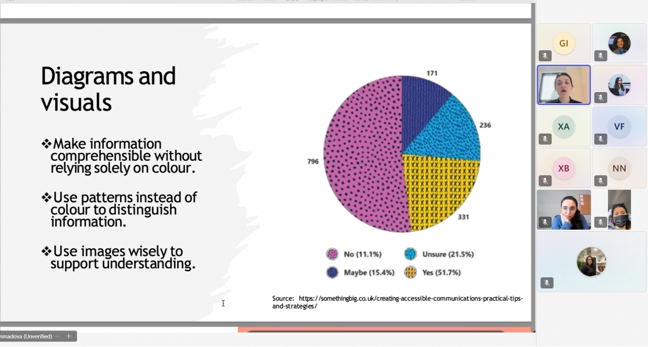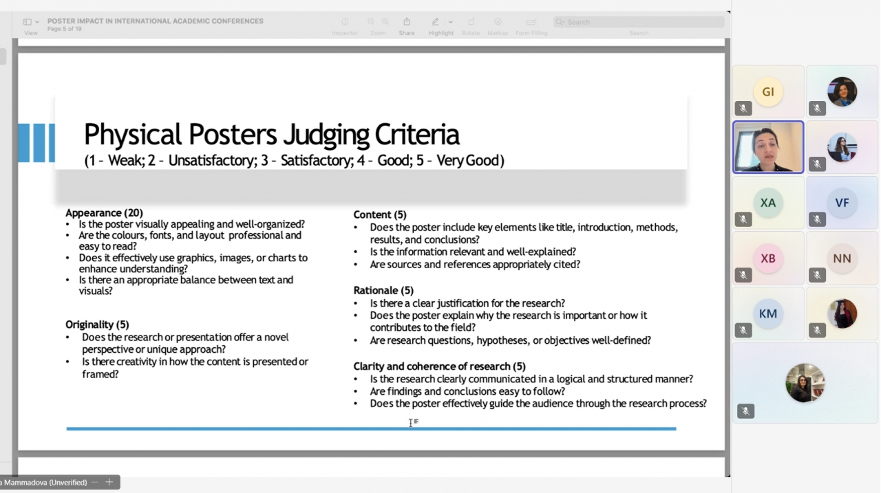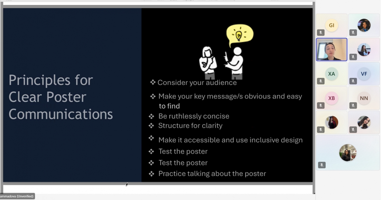 Seminarda, həmçinin, aydınlıq və əlçatanlıq üçün dizayn prinsipləri, eləcə də beş dəqiqəlik poster təqdimatının səmərəli qurulması üsulları müzakirə olunub. Doktorant Aynur Məmmədova - Dadaşova iştirakçılara e-poster və çap formatı üzrə praktik tövsiyələr, auditoriya ilə effektiv ünsiyyət strategiyaları və posterin tam hazır vəziyyətə gətirilməsi üçün yoxlama siyahısı təqdim edib.