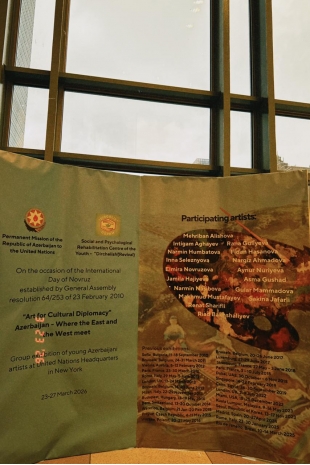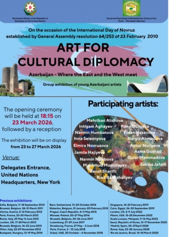 ABŞ-da, Birləşmiş Millətlər Təşkilatının Nyu-York şəhərində yerləşən Mənzil Qərargahında Novruz bayramı münasibətilə “Mədəni diplomatiya üçün incəsənət: Azərbaycan – Şərqlə Qərbin qovuşduğu məkan” adlı sərgi təşkil olunub. Sərginin kataloqunda Azərbaycan Respublikasının Prezidenti, Ali Baş Komandan İlham Əliyevin Novruz bayramı və Azərbaycan mədəniyyəti ilə bağlı fikirlərinə yer verilib.