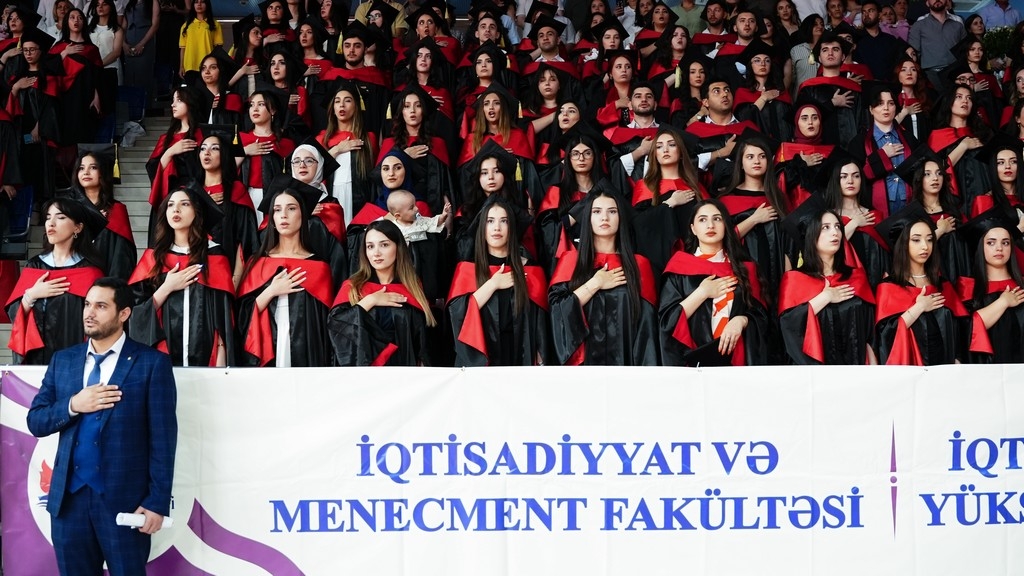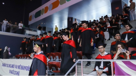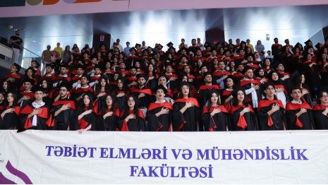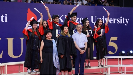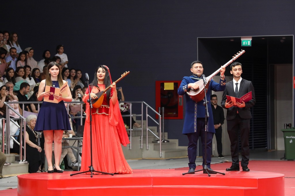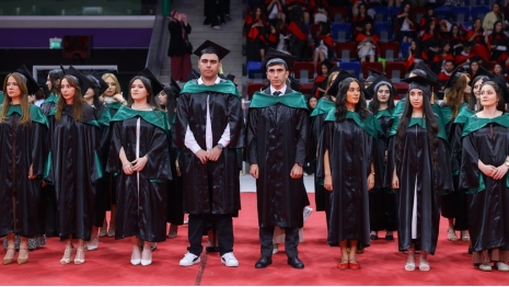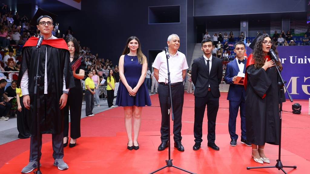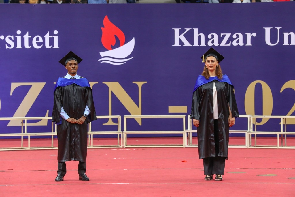 The Khazar University anthem was sung. The graduates took an oath that they would be beneficial to their families, people, and homeland by applying the knowledge and skills acquired at Khazar University, and would preserve the honor of Khazar University. The oath text was read by School of Economics and Management graduates Fuad Amraliyev and Aytac Shahveranova.