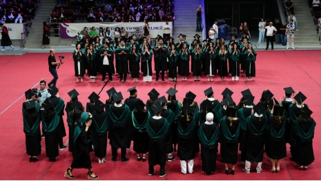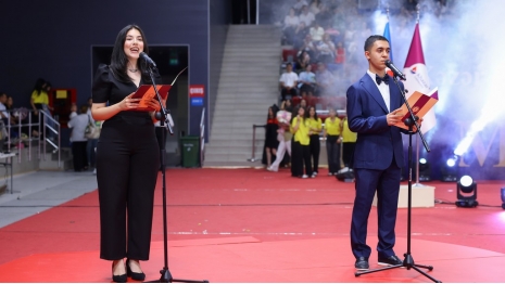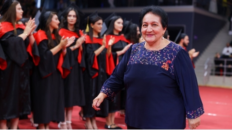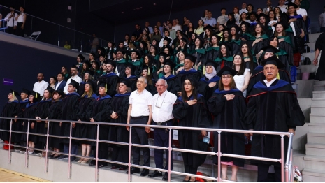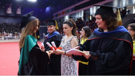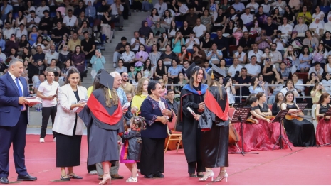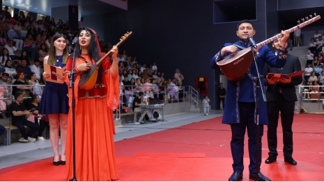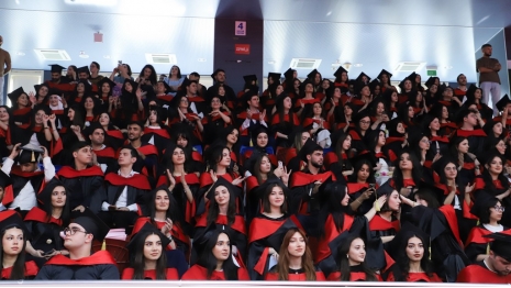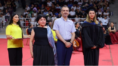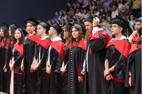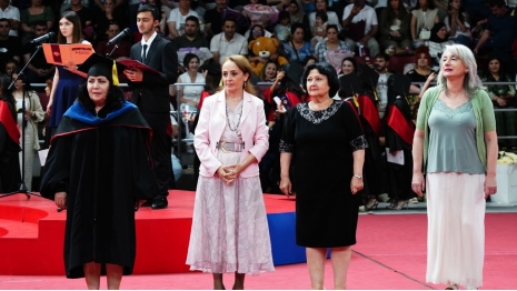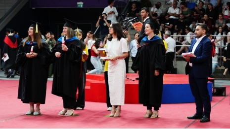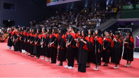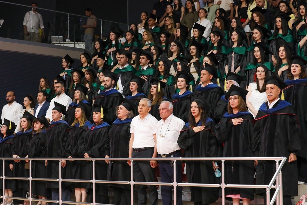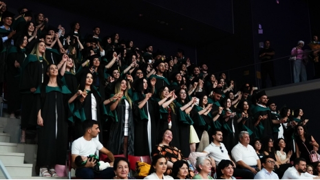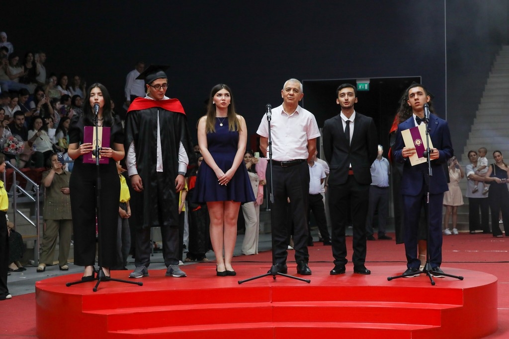 The Khazar University anthem was sung. The graduates took an oath that they would be beneficial to their families, people, and homeland by applying the knowledge and skills acquired at Khazar University, and would preserve the honor of Khazar University. The oath text was read by School of Economics and Management graduates Fuad Amraliyev and Aytac Shahveranova.