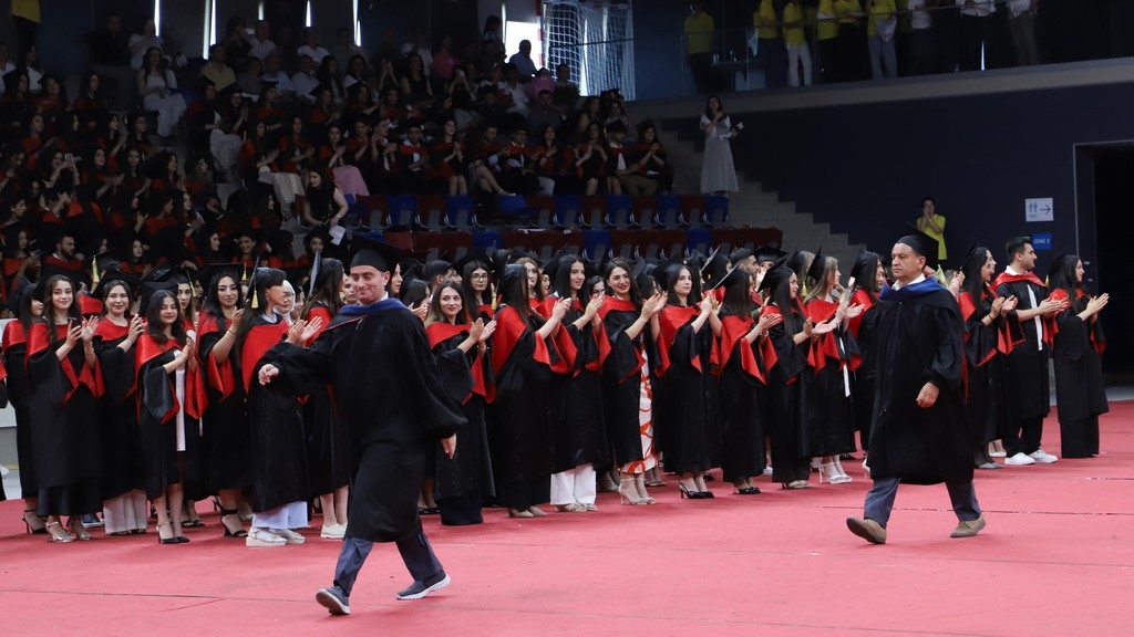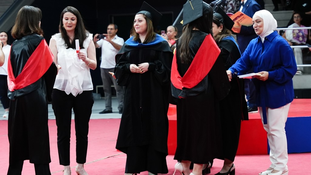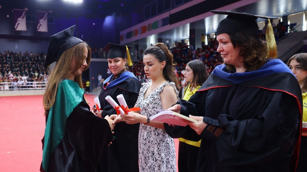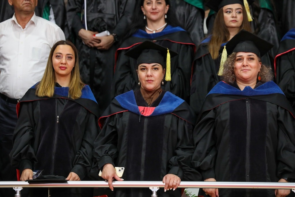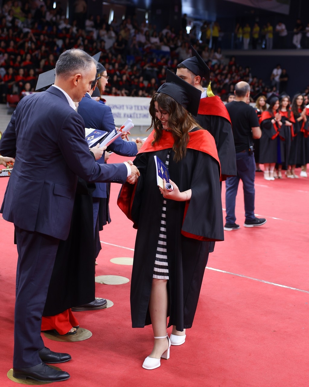 Subsequently, the presentation of diplomas to bachelor's and master's degree recipients began. Graduates from the faculties of Natural Sciences and Engineering, Economics and Management, Humanities, Education and Social Sciences, Hasvet Veterinary Medicine, Graduate School of Science, Arts and Technology, and Graduate School of Economics and Business were invited to the stage. The diplomas were presented to graduates by university administration, faculty deans, department heads, teachers, and staff members.
