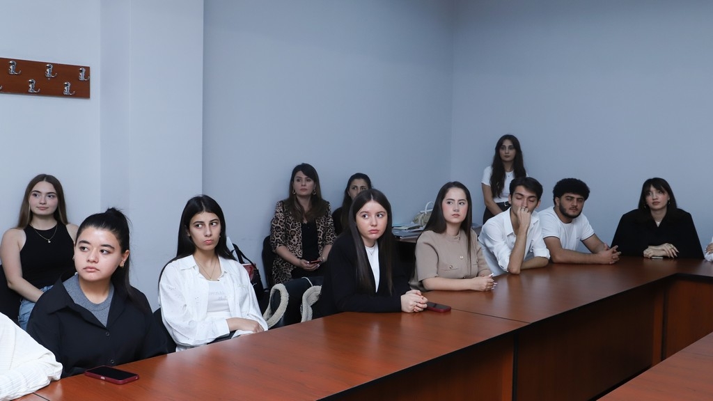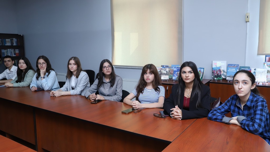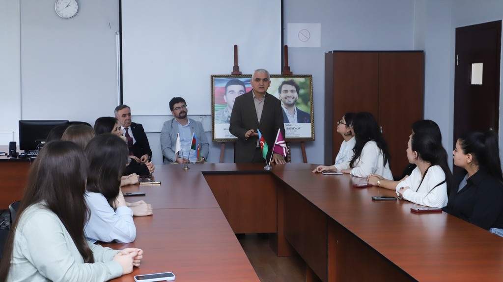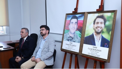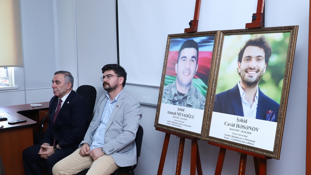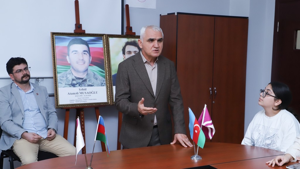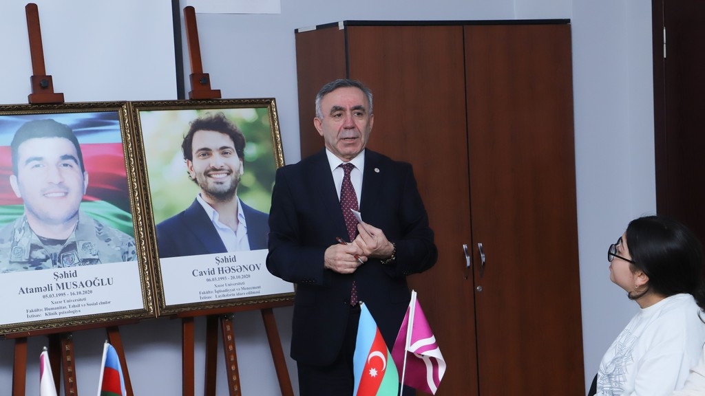 The memory of the martyrs who sacrificed their lives for the homeland was honored with a minute of silence. Subsequently, Associate Professor Telman Nusratoglu, Director of the Department of History and Archaeology, Director of Public Relations and Media Alovsat Amirbayli, and department lecturer Dr. Odar Alizade, along with students, delivered speeches discussing the historical significance of Memorial Day and how the martyrs will live eternally in the memory of the Azerbaijani people. Information was provided about the lives and student years of Atamali Musaoglu and Javid Hasanov, who were students at Khazar University and heroically reached the pinnacle of martyrdom in the battles. Their example of patriotism was presented as a model for young people.