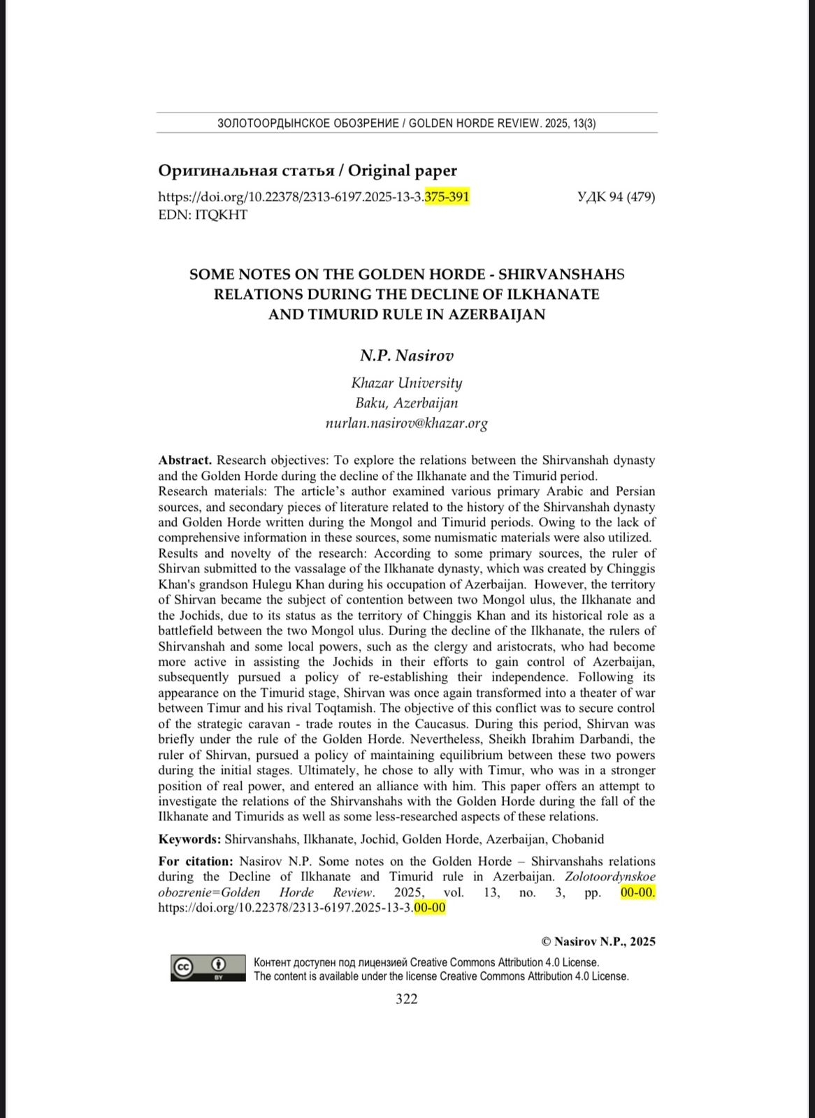 An article by Dr. Nurlan Nasirov, faculty member of the Department of History and Archaeology at Khazar University, titled "Some Notes on the Golden Horde – Shirvanshahs Relations during the Decline of Ilkhanate and Timurid Rule in Azerbaijan" has been published in the international scholarly journal "Golden Horde Review" (Volume 13, Issue 3, October 2025, pp. 322-338). It should be noted that "Golden Horde Review" is a journal indexed in the Scopus and Web of Science databases and is a Q1 category publication.