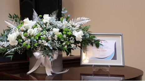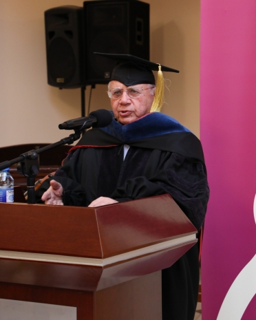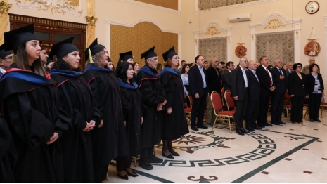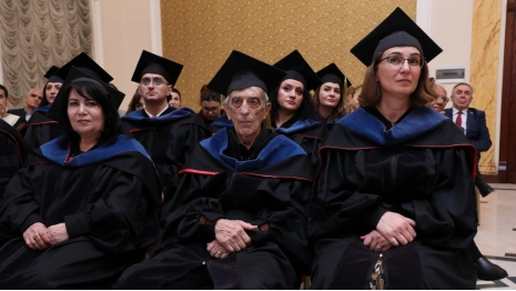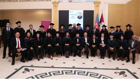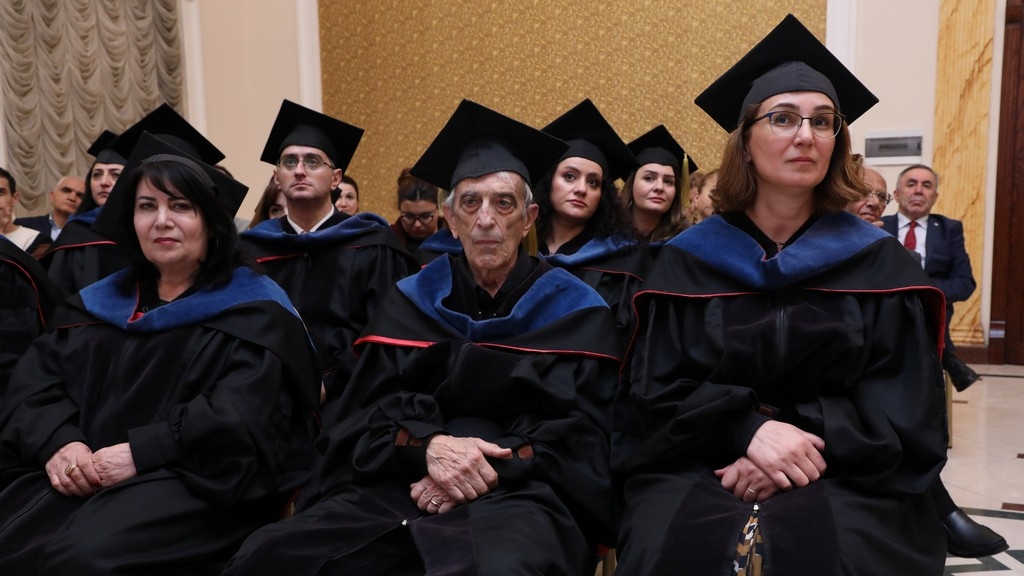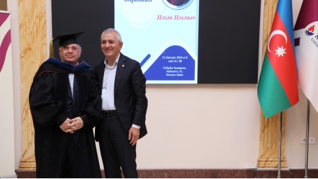 The Honorary Doctorate diploma was presented to prominent statesman and scholar Hasan Hasanov by the university's founder and Chairman of the Board of Directors and Trustees, Prof. Acad. Hamlet Isakhanli. Hasan Hasanov delivered a speech expressing his gratitude for the high recognition of his scholarly work and wished success to Khazar University.