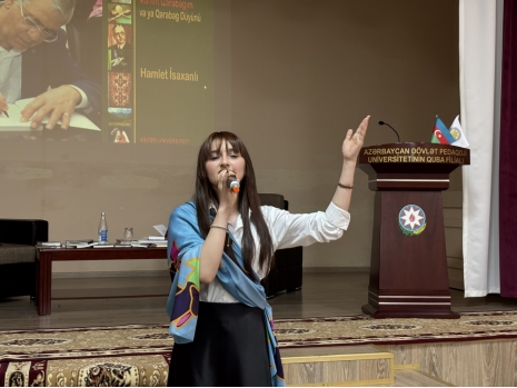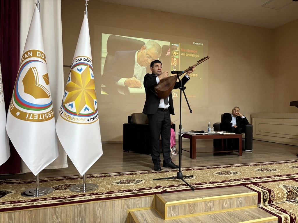 The event was accompanied by an artistic segment. Ashiq Ramin Garayev, lecturer at Khazar University's Department of Music and Arts, performed songs he had composed to Hamlet Isakhanli's poems with the saz. Branch students recited the poet's poems and performed songs and dances.