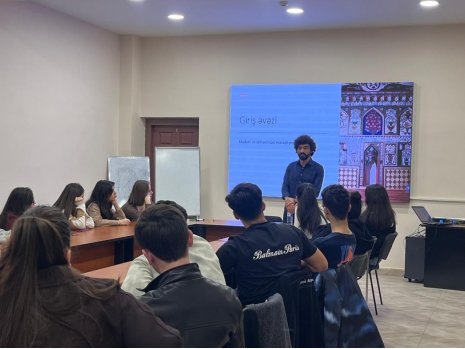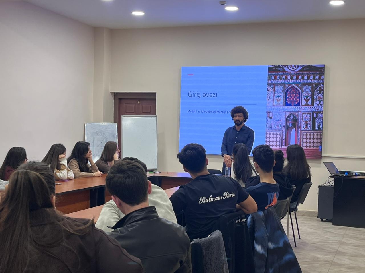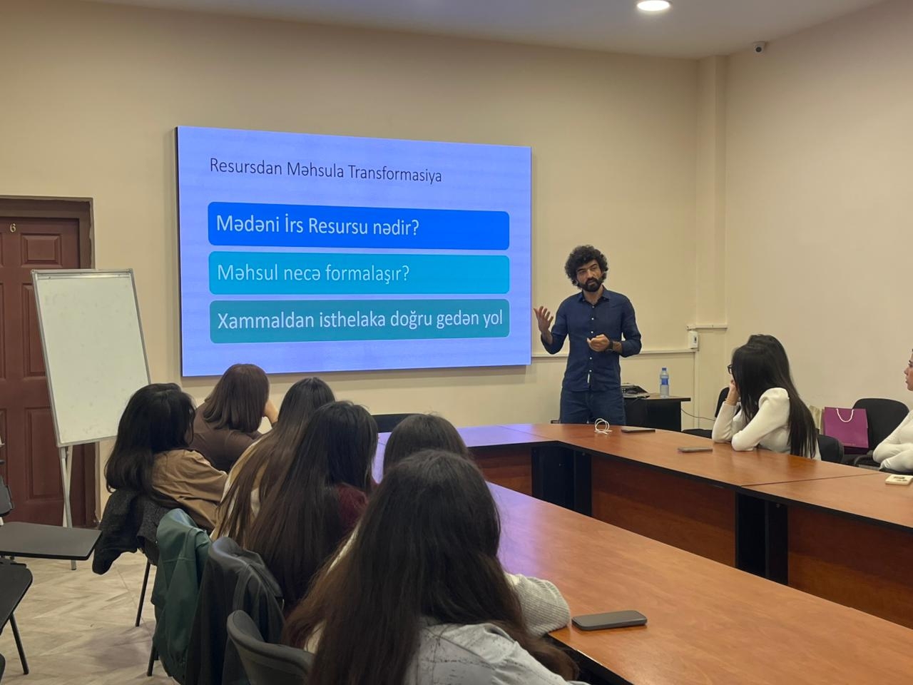 During the meeting, Elchin Karimov provided students with detailed information about local and international methods, practices applied in the field of cultural heritage preservation and utilization, as well as the essence of international conventions. Within the framework of the presentation, World Heritage sites, UNESCO selection criteria, protection principles, and the international management system were explained.