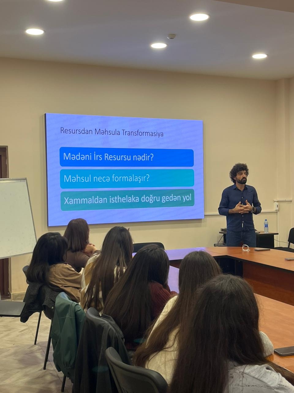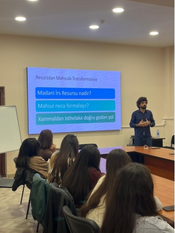 An educational meeting on "Cultural Heritage and Tourism" was organized on November 27, 2025, for first-year Tourism major students of the School of Economics and Management at Khazar University. Elchin Karimov, a specialist in Cultural Heritage and Cultural Tourism, participated in the event.