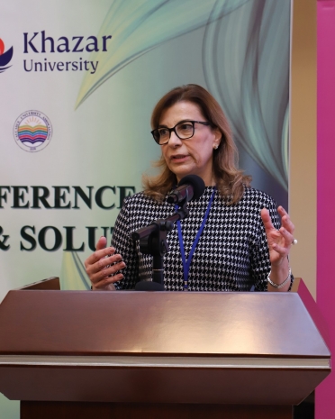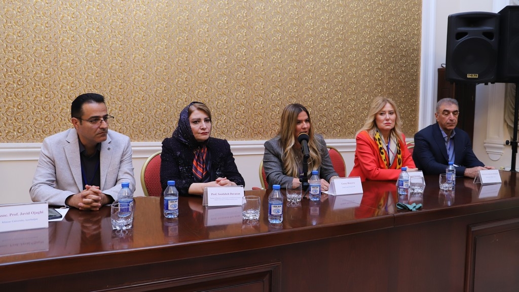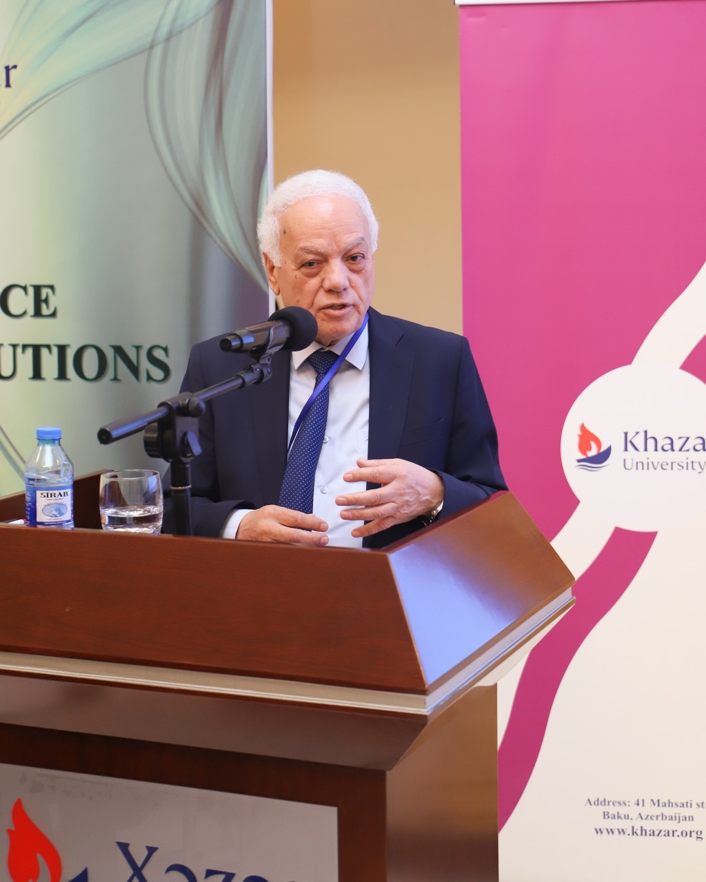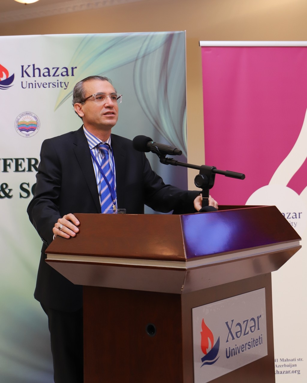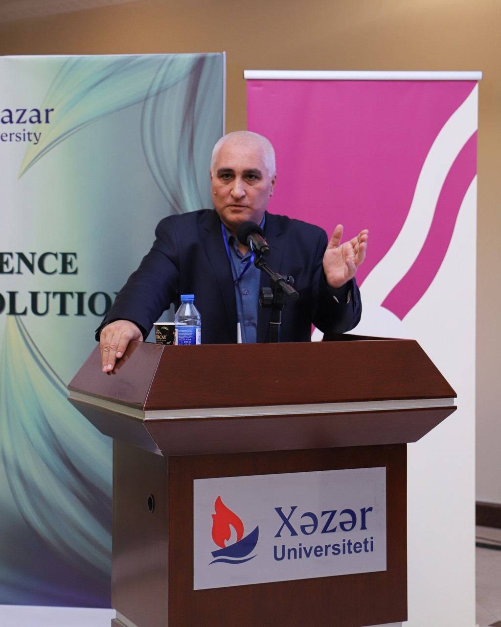 On the first day of the conference, the Climate Change, Health, and Food Security session was moderated by the chair, Assoc. Prof. Irada Khalilova, Prof. Seyyed Abolghasem Mohammedi, Assoc. Prof. Javid Ojaghi. The key speakers, Dr Rovshan Abbasov (Director of the Environmental Research Centre of Khazar University), Prof. Adil Allahverdiyev (Director of the V.Y. Akhundov Scientific Research Institute of Medical Prophylaxis), Prof. Seyyed Abolghasem Mohammadi (Professor of the School of Agriculture at University of Tabriz and director of the Iran National Wheat Innovation Centre), Prof. Tansel Çomoğlu (Professor of the Department of Pharmaceutical Technology, Faculty of Pharmacy, Ankara University, Türkiye), and Prof. Soodabeh Davaran (Professor of the Medical University of Tabriz, Iran), delivered speeches at the session.