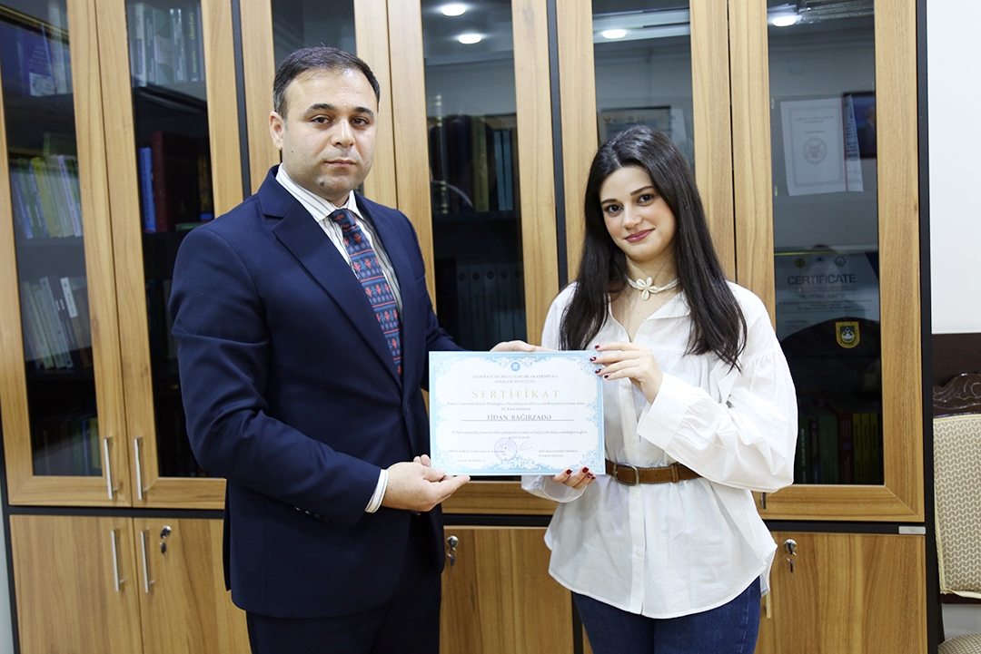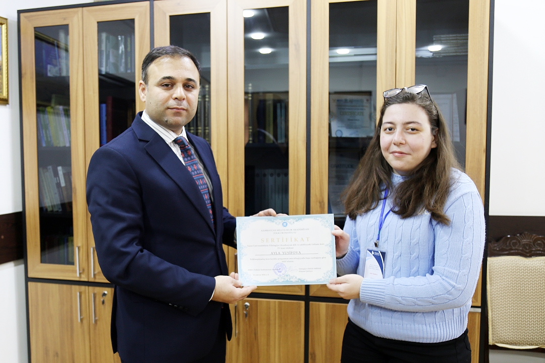 Within the framework of the internship, students closely studied the activities of the institute during October-December, and obtained information about scientific research, publications and current problems in the field of folklore studies. They also delivered reports and presentations at a number of scientific events, including the I International Symposium on Traditional Music and Cultural Identity of the Turkic World, the II Republican Scientific Conference "Western Azerbaijan Folklore: Problems and Perspectives," scientific sessions on the topics "Lachin: Traces of Cultural Memory Seen in Folklore," "The Epic of Victory of Forty-Four Days" dedicated to the 5th anniversary of the Glorious Victory in Karabakh, as well as "The Folklore Context of Bakhtiyar Vahabzadeh's Creative Work."