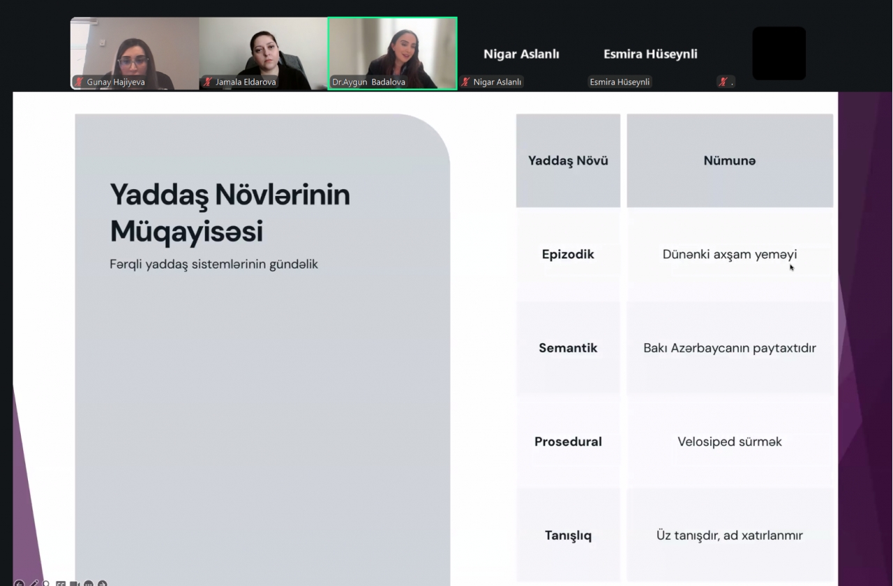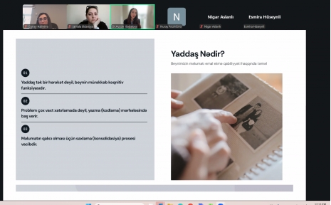 During the seminar, detailed discussions were held on the brain regions involved in memory formation and the mechanisms of that process, the characteristics of short-term and long-term memory, the effects of emotions, sleep, and stress on memory, as well as the primary causes of forgetfulness. Through interactive exercises, participants were given a practical demonstration of the role of attention in the memory process, and practical strategies for enhancing memory were shared. Faculty members and students of Khazar University actively participated in the seminar.