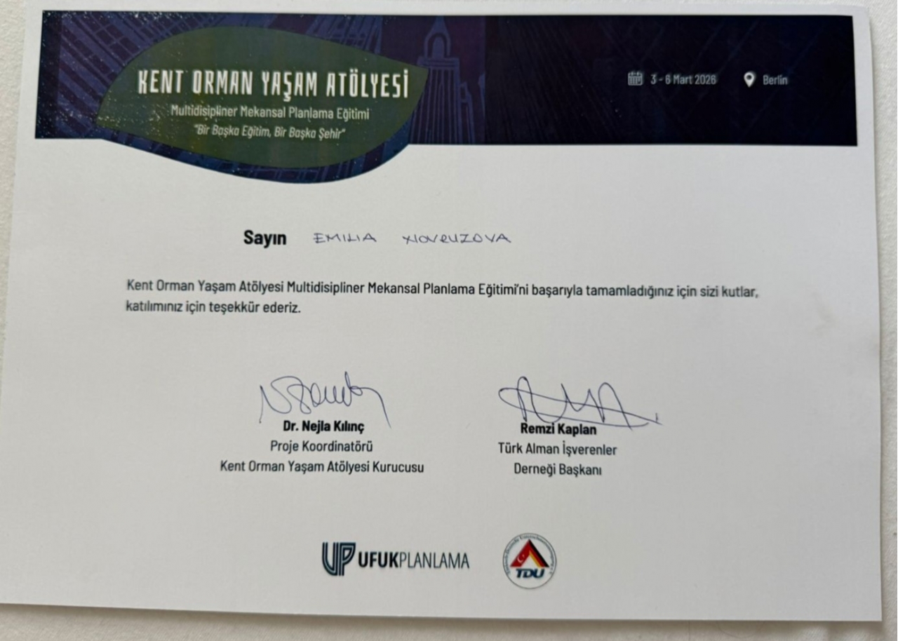 Elmira Novruzova, a second-year student majoring in Architecture at the School of Science and Engineering of Khazar University, participated in the 8th meeting of the Urban Forest Living Workshop — Multidisciplinary Spatial Planning Training, held in Berlin, Germany, and was awarded a certificate. The certificate was signed by project coordinator and founder of the Urban Forest Living Workshop Nejla Kılınç and President of the Turkish-German Employers' Association Remzi Kaplan.