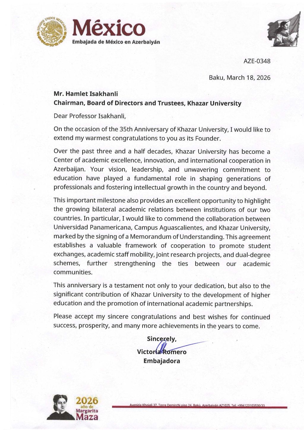 NEWS 14 April, 2026Khazar University Delegation at Sabancı University 10 April, 2026Exhibition Held at Khazar University with the Participation of Lithuanian Prime Minister Ingrida Šimonytė 08 April, 2026"Study in Azerbaijan" International Education Fair Continues 07 April, 2026"Study in Azerbaijan" Exhibition and Rectors' Forum Held in Almaty 31 March, 2026Khazar University Rector Visit Akdeniz University 20 March, 2026Meeting with Alumni at "Khazar" 19 March, 2026Opening Speech by Prof. Acad. Hamlet Isakhanli, Founder of Khazar University and Chairman of the Board of Directors and Trustees, at the Ceremony Dedicated to the 35th Anniversary of Khazar University 18 March, 2026Khazar University's 35th Anniversary Ceremony Held 15 April, 2026English Language and Literature Department Professor’s Article Published in “Education and Law Review” Journal 15 April, 2026Turkish PhD Students Complete Internship Program at Khazar University