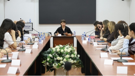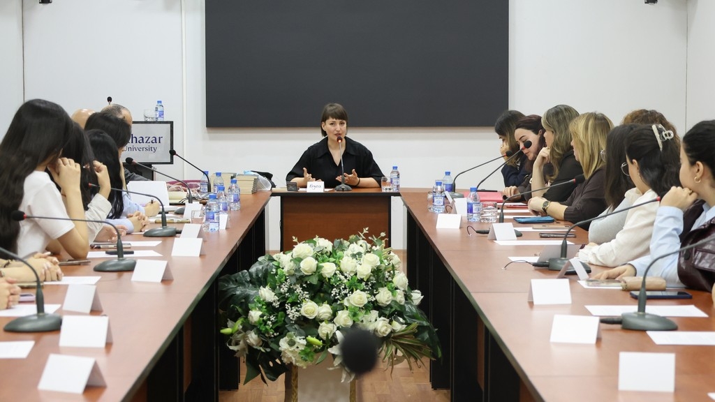 Following the event, Khazar University Rector Dr. Razia Isaeva received writer Regina Dürig and the embassy representative. Prospects for future cooperation were discussed at the meeting, and a letter of appreciation was presented to the writer on behalf of the university.